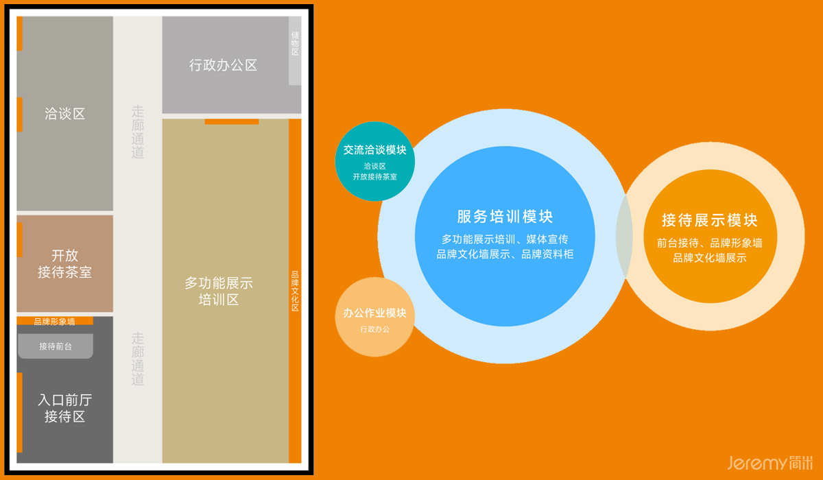 接待展示模块:作为品牌第一印象窗口,入口前厅接待区以品牌形象墙与接待前台形成视觉焦点。简米设计在接待台规范中,采用白色烤漆面板与品牌色挡板的材质对比,搭配精准的尺寸规划(如 85cm 高度符合人体工学),既保证接待效率,又通过 LOGO 与品牌标语的有序陈列传递专业形象。